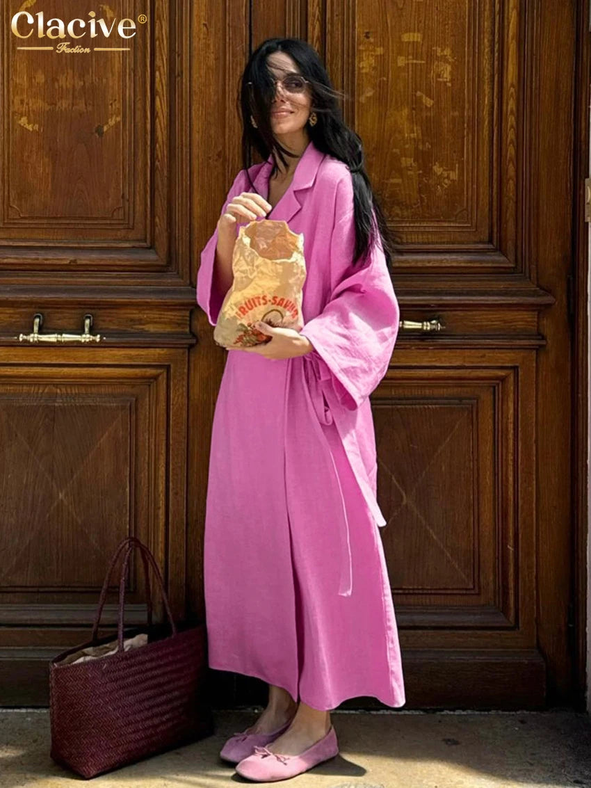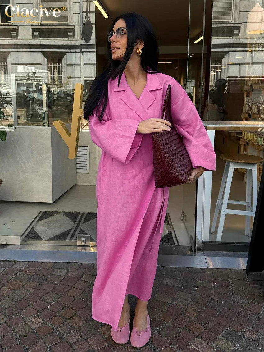 Clacive Casual Loose Pink Cotton Dress Ladies Fashion Lapel Long Sleeve Ankle Length Dress Elegant Lace-Up Dresses For Women