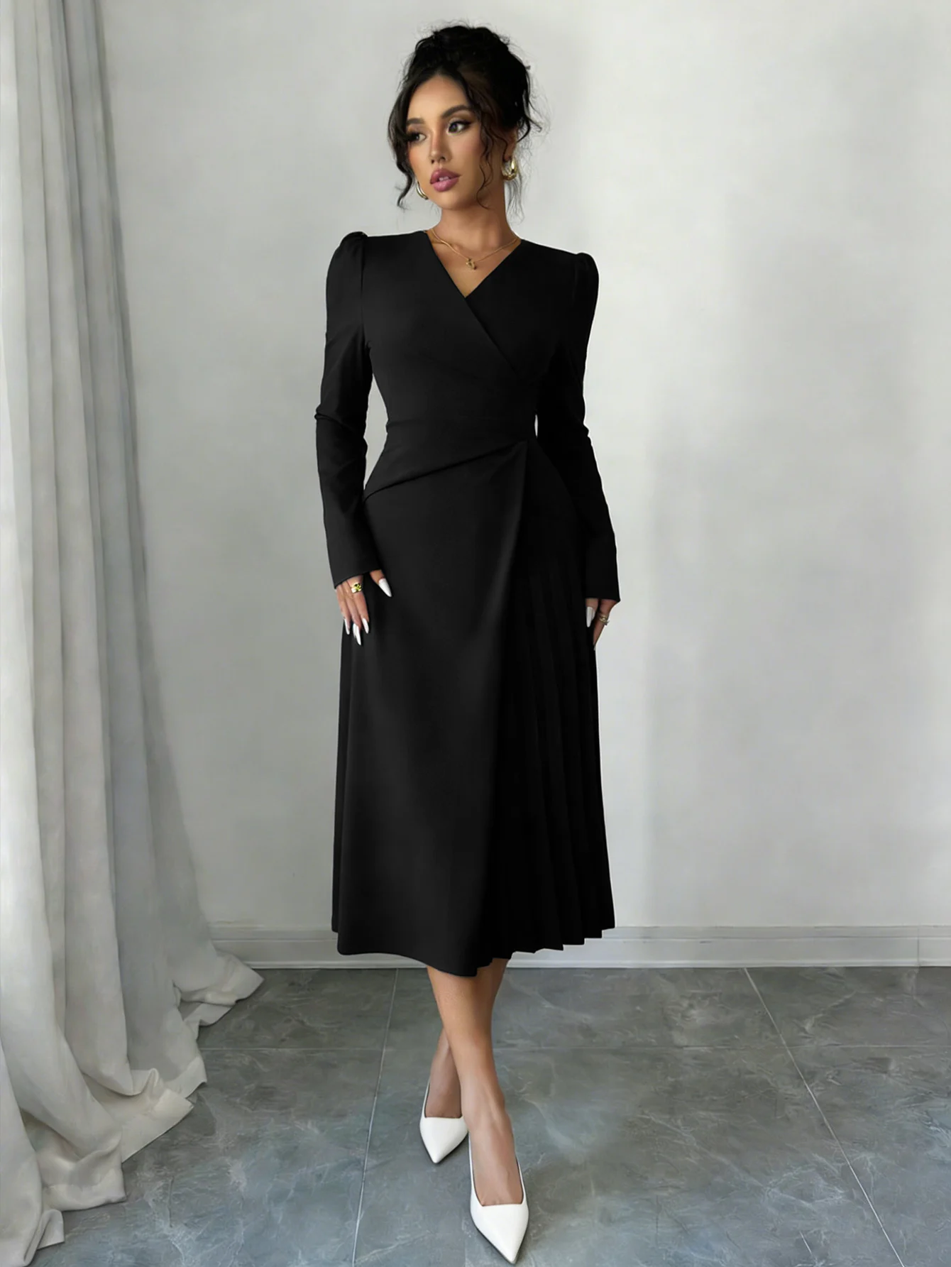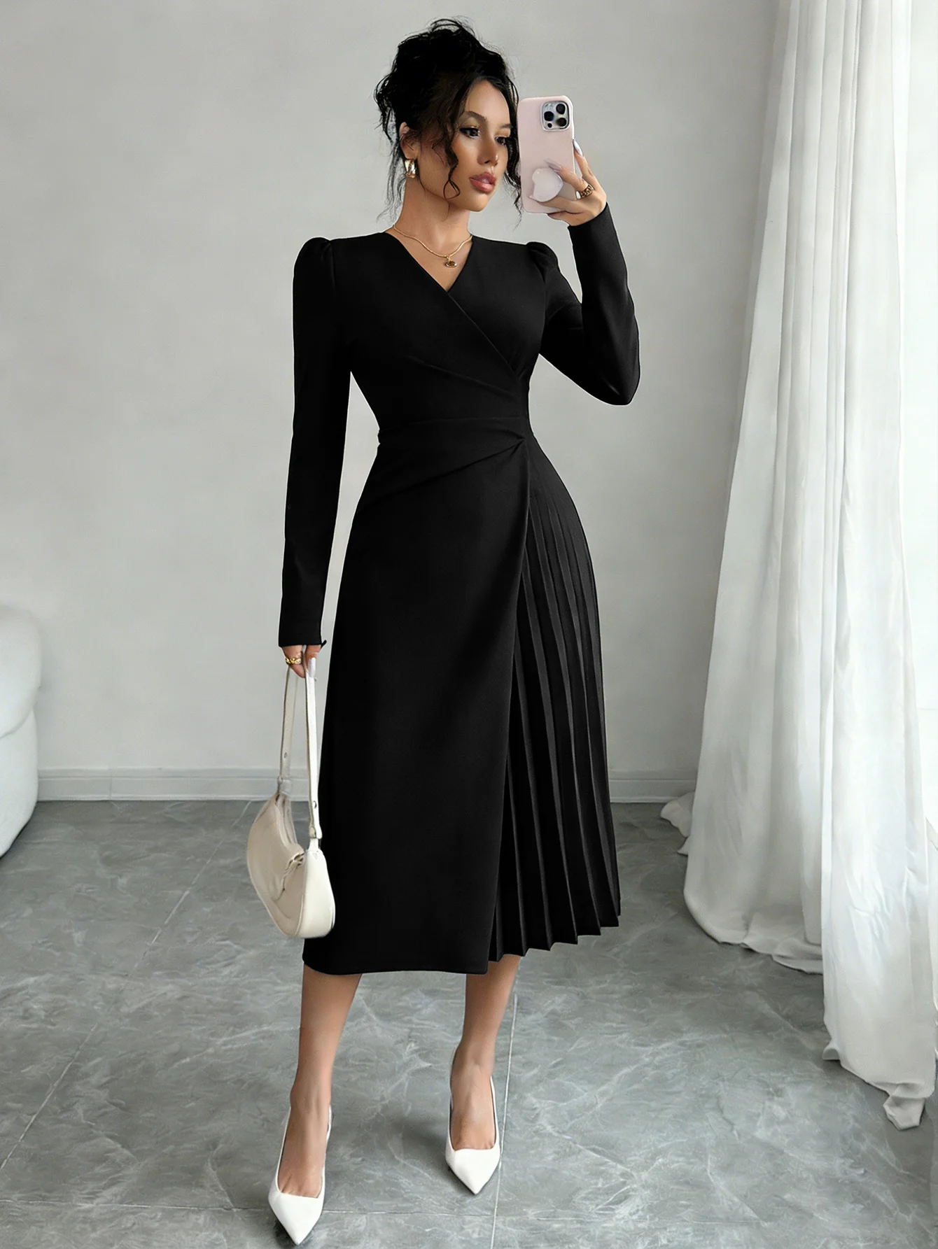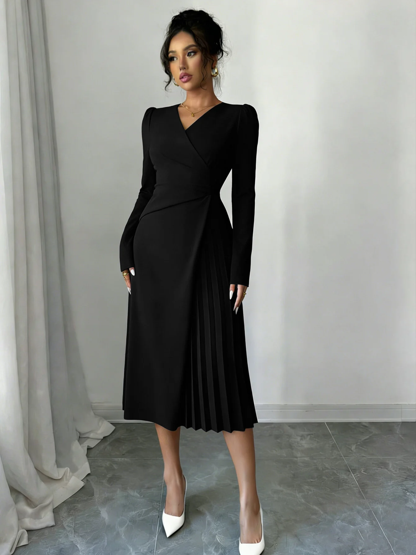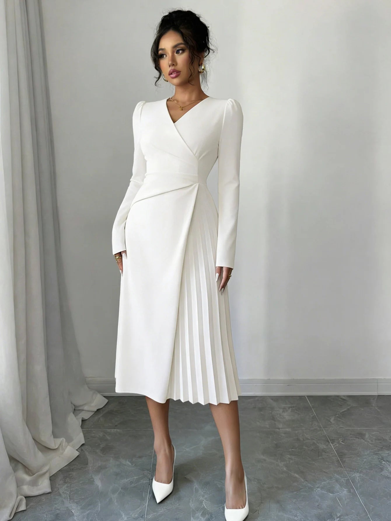 Ladies' spring and autumn business suit, waist-cinching, V-neck, elegant, slimming, pleated, long-sleeved dress for commuting.