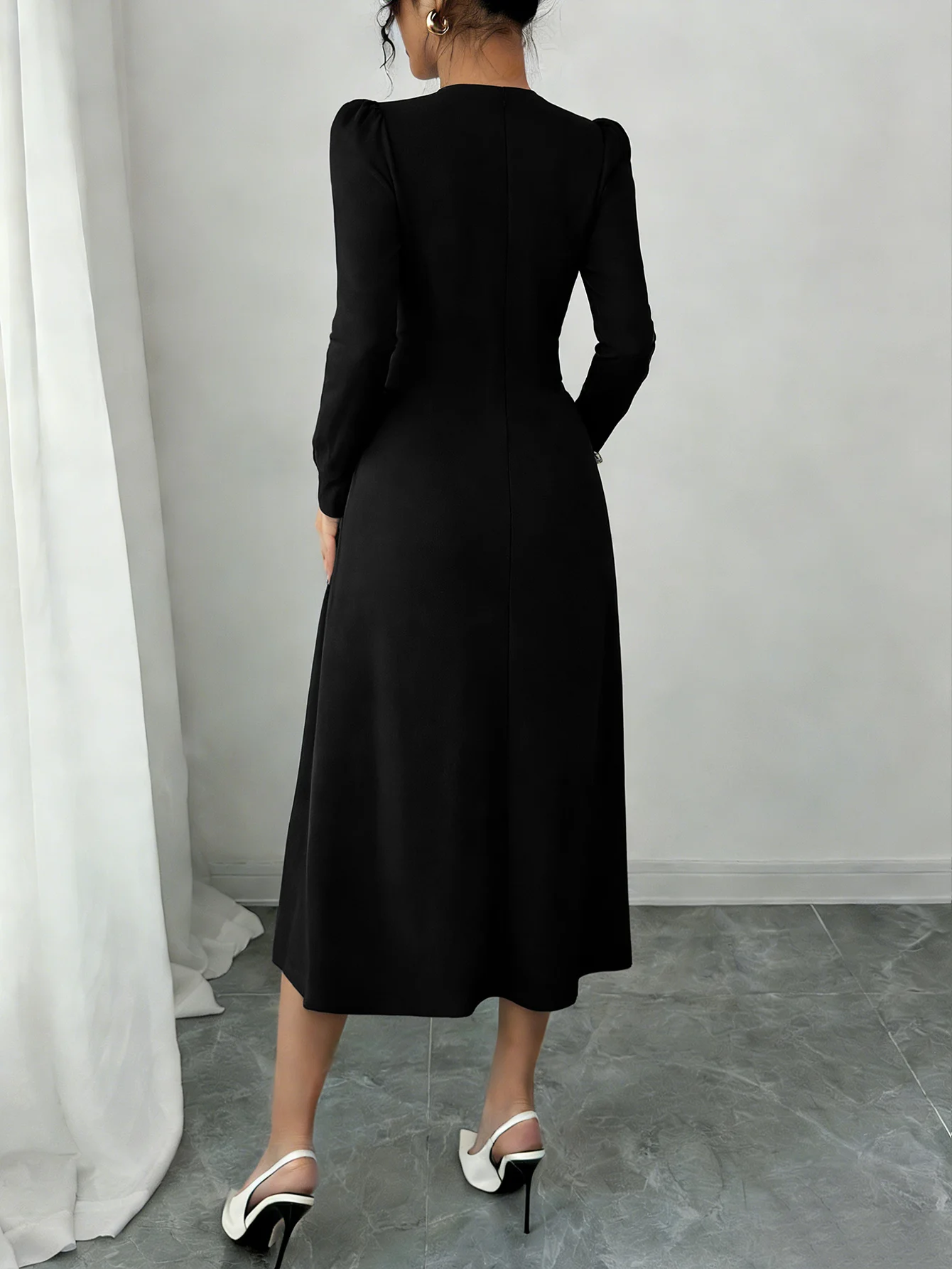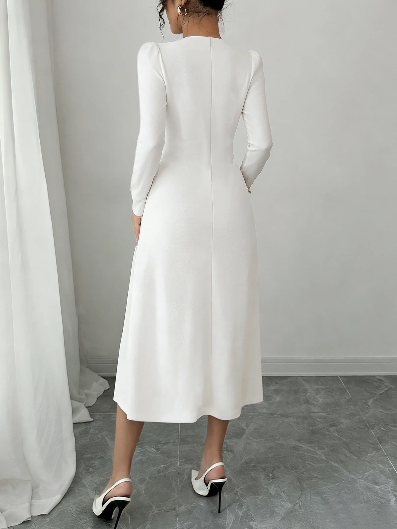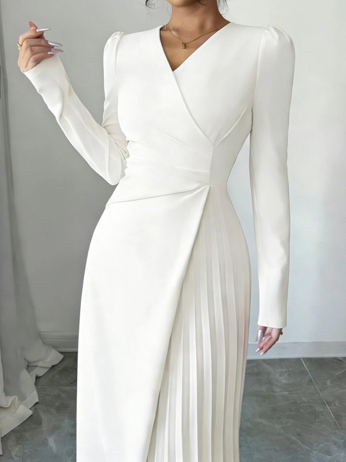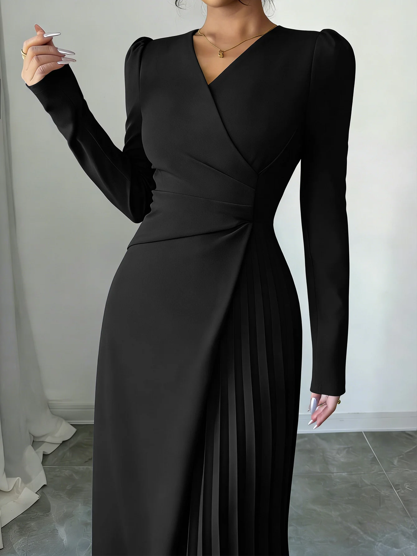 Ladies' spring and autumn business suit, waist-cinching, V-neck, elegant, slimming, pleated, long-sleeved dress for commuting.