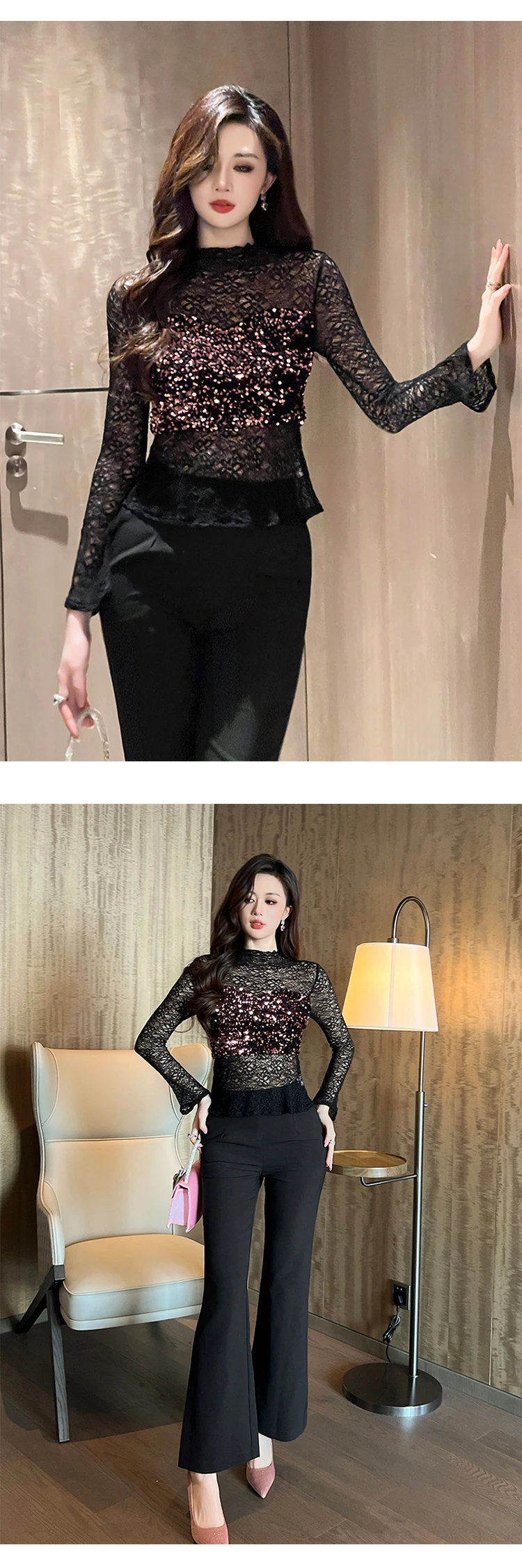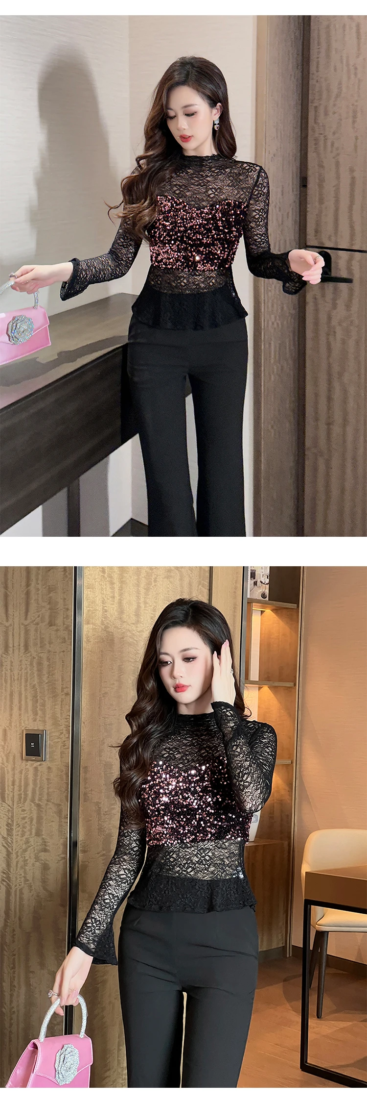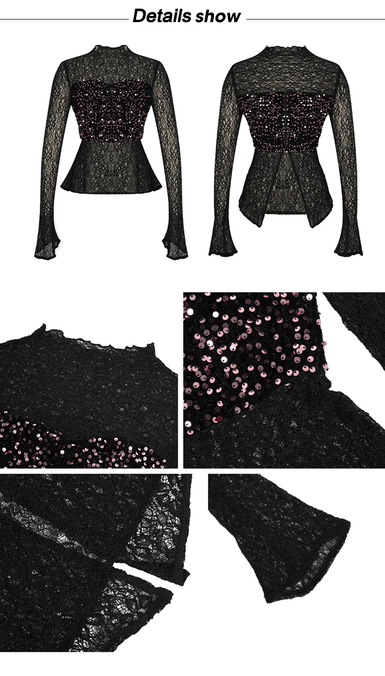 Women's Clothing Chic Black Lace Sexy T-Shirt Ladies Elegant Perspective Short Blouses Sequin Tops Bottom Pullover Jumper Party