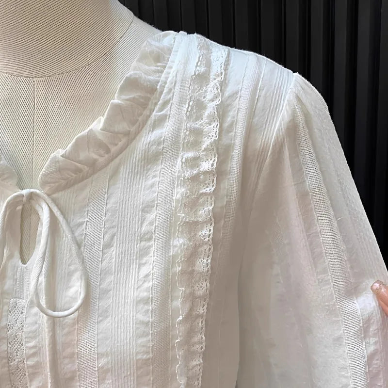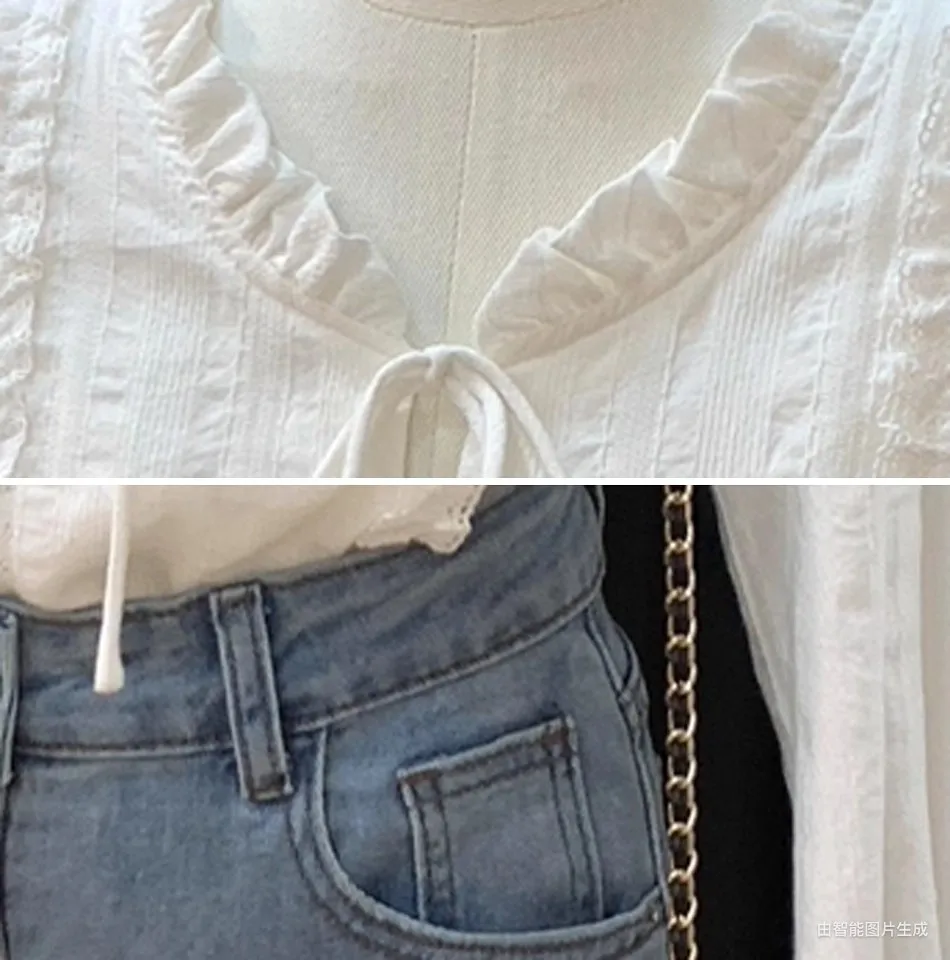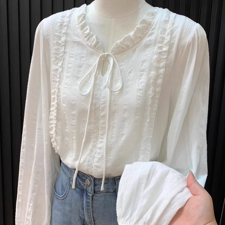 Women's Clothing French Lace Collar Lace-up Shirt for Women Gentle Style Long-sleeved Top Blouses